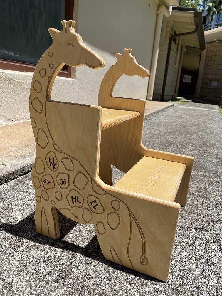 Aim high, stand tall, and get spotted! A beautiful stool made in the shape of our favorite zoo animal... a giraffe! With the giraffe head as the handles, this sturdy stool, made out of birch wood, has our class name "Sparkle Giraffes" engraved on its steps. Each child's handwritten initials are wood burned on the stool.
