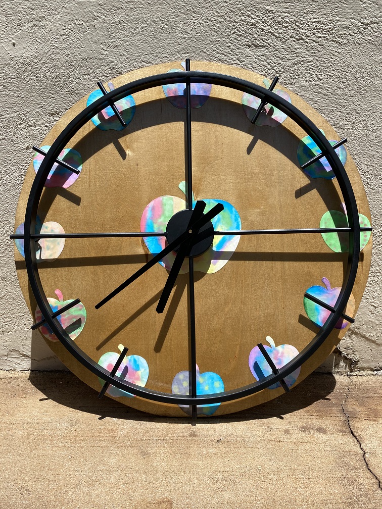 Mix the new with the old and add a whimsical twist to your home with this new metal and wood clock decorated with water-colored apples created by each child.