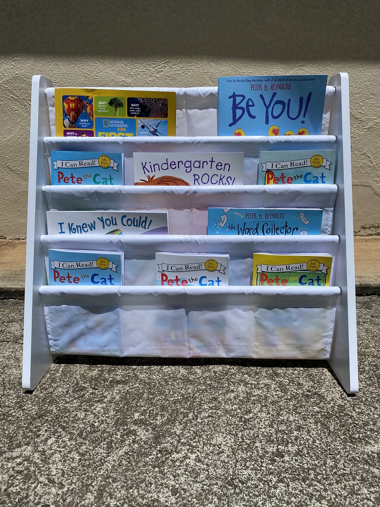Children sized book rack decorated with self-portraits drawn by the B1 Lightning Cars! It also features four fabric storage pockets filled with books for your child to enjoy. Books were thoughtfully picked out to celebrate your child and to get a jump start in reading.