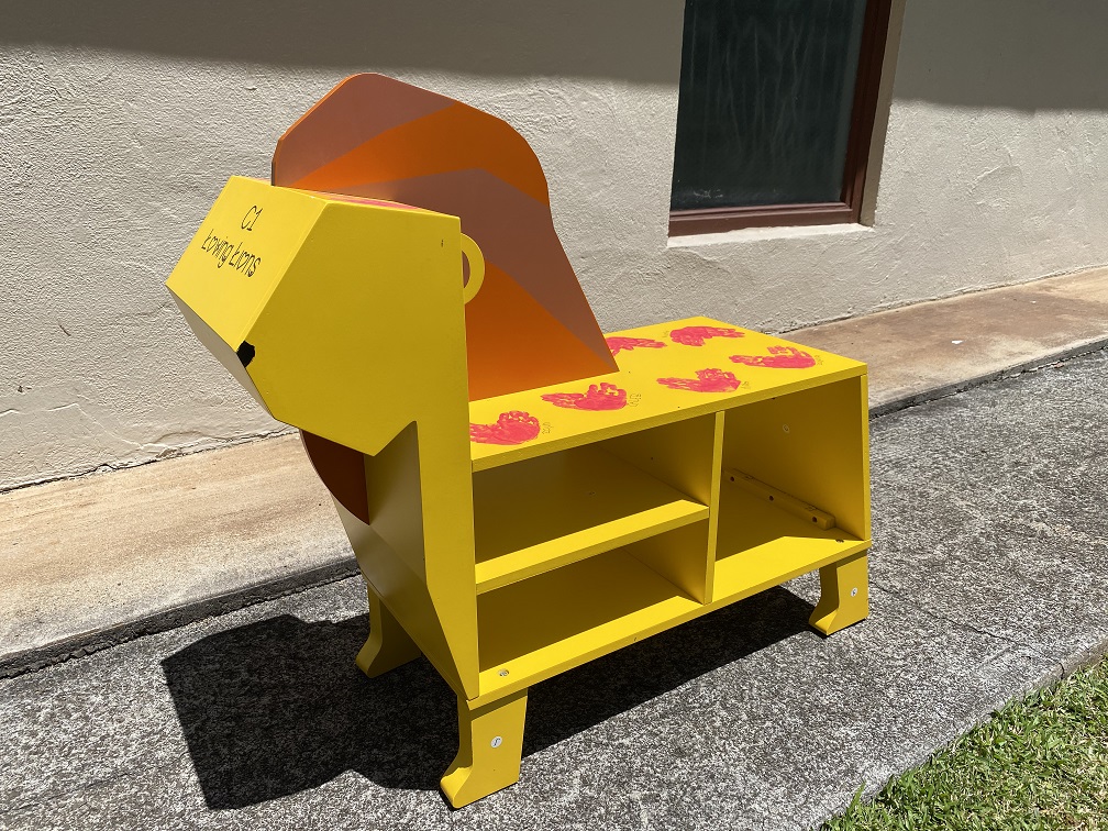 This one-of-a-kind wooden lion bookshelf features heart shaped handprints by our C1 class. Perfect for storing and organizing books and games for your child.