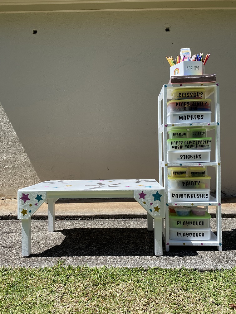 A one-of-a-kind art table decorated with the hands of our B2 class, joined together in the shape of stars. This table includes a shelf, abundantly stocked with an assortment of art materials that any child would love to use to creatively express themselves.
